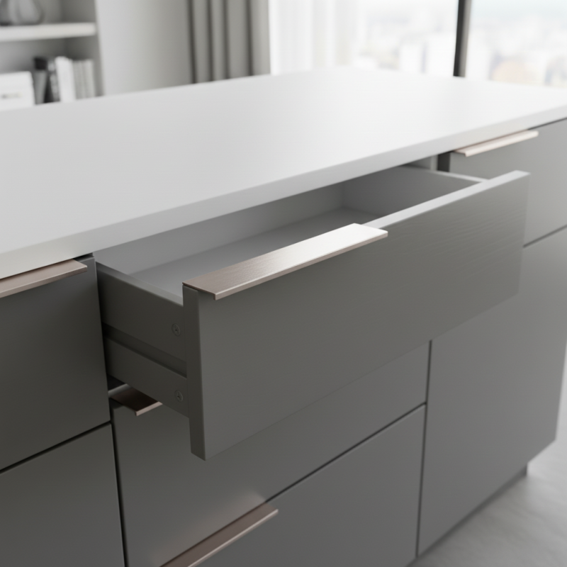 Modern CANSAS fogantyú elegáns kefélt nikkel kivitelben, amely ajtók vagy fiókok élére szerelhető. A szaténcsiszolt felület időtlen, tiszta hatást kelt, és harmonikusan illeszkedik a modern konyhákhoz, fürdőszobákhoz és minimalista bútorokhoz. A fogantyú kényelmes fogást biztosít anélkül, hogy megzavarná a bútorfelület összképét.