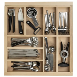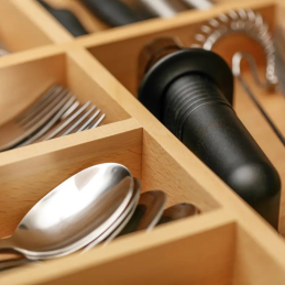 Az állítható kialakításnak köszönhetően az evőeszköztartó tökéletesen igazodik a fiók méretéhez, és áttekinthető tárolást biztosít az evőeszközök, konyhai eszközök vagy apróbb kellékek számára. Az időtlen bükkfa dizájn modern és klasszikus konyhákba egyaránt illik.