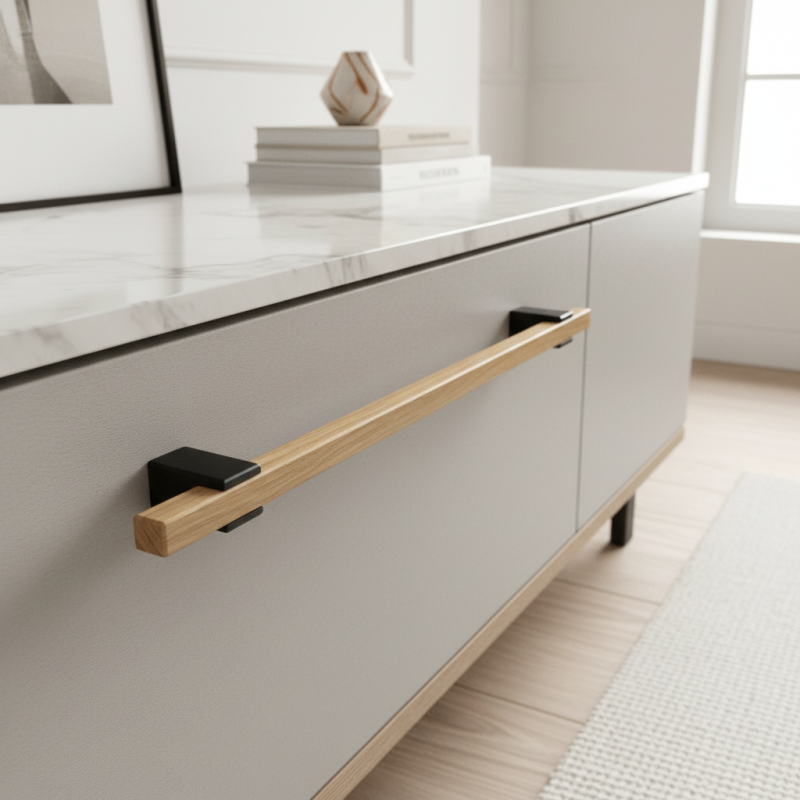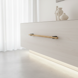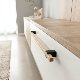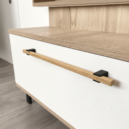 A ALVEA fa fogantyú lakkozott tölgy kivitelben egy dizájnelem, amely teljes egészében fából készült – beleértve a fekete tartókat is, amelyek szintén fából készültek és matt fekete árnyalatra vannak felületkezelve. Ennek köszönhetően a fogantyú harmonikus, meleg és természetes hatást kelt, ugyanakkor modern és elegáns.