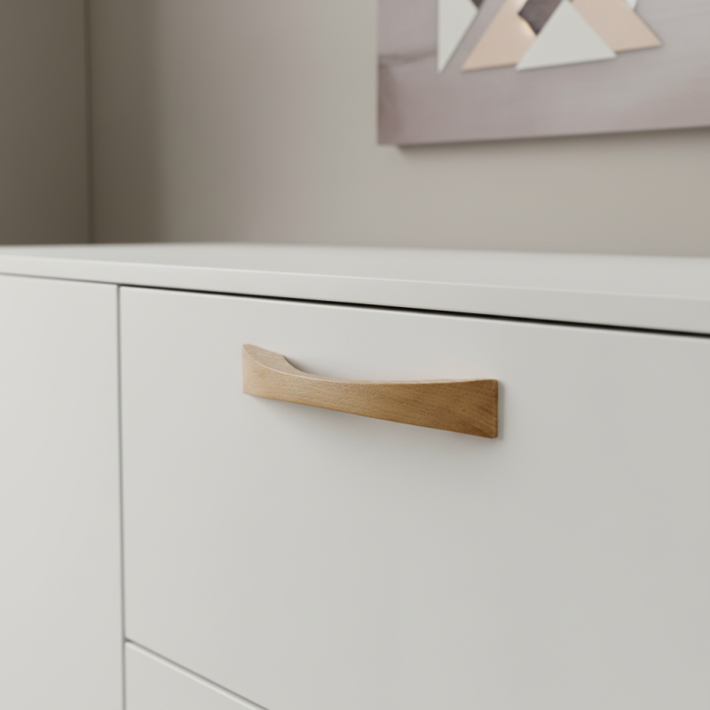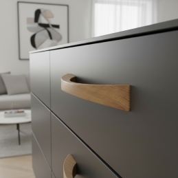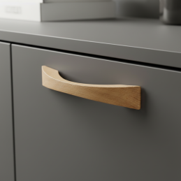 A GALEOS fa fogantyú lakkozott tölgy kivitelben egy dizájnelem, amely ötvözi a modern eleganciát az igazi természetes anyaggal. Enyhén ívelt formája légies és könnyed hatást kelt, ugyanakkor kényelmes fogást biztosít a mindennapi használat során. A lakkozott tölgy kiemeli a fa természetes erezetét, és hosszú távú védelmet nyújt a felületnek.