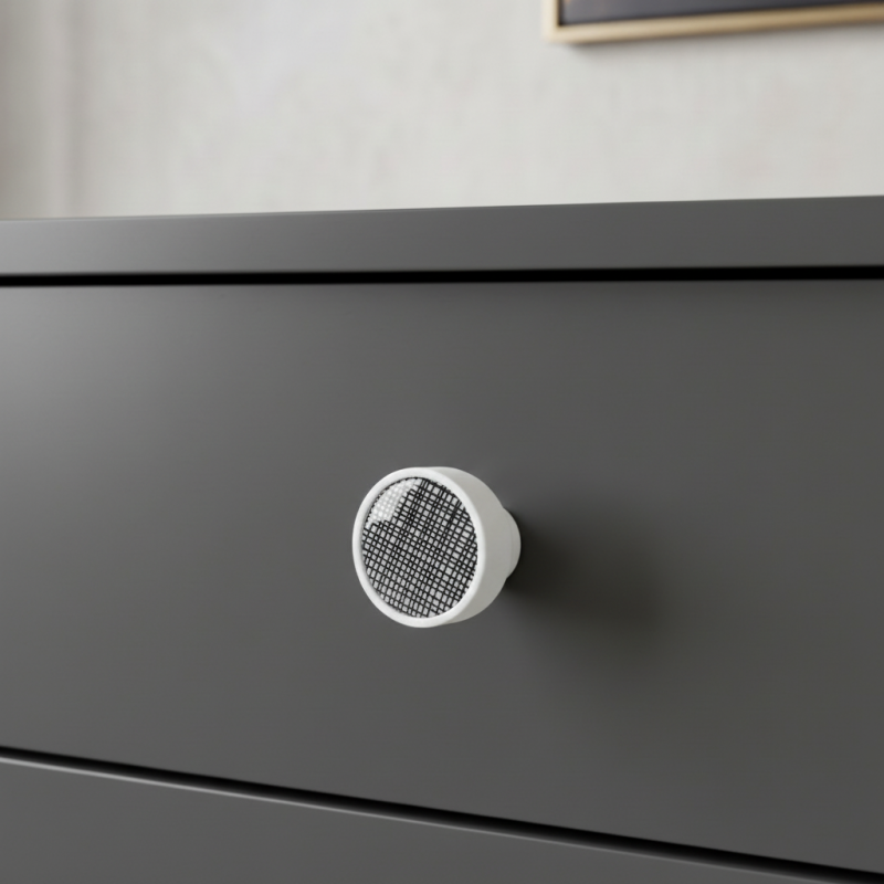 Fa fogantyú ARSIA fehér kivitelben, modern fekete-fehér rácsmintával, stílusos kiegészítő, amely kiemelkedik a modern, skandináv és minimalista enteriőrökben. A tömör bükkfa, a minőségi fehér lakk és a karakteres geometrikus minta kombinációja eredeti, dizájnos jelleget kölcsönöz a bútornak.