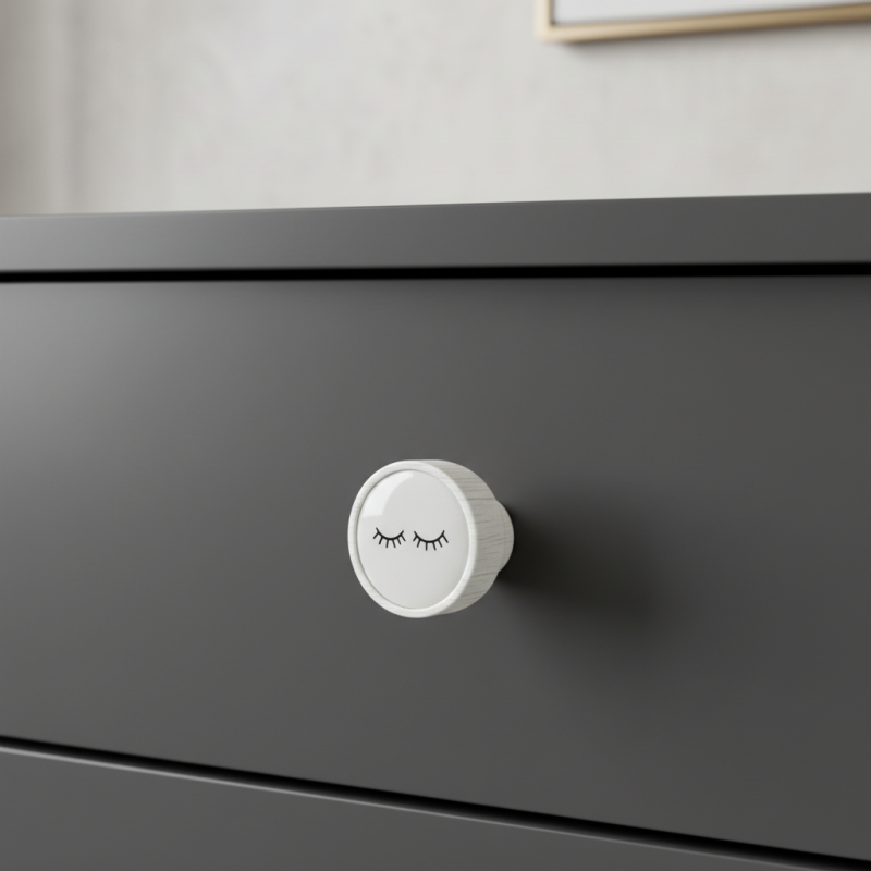 A ARSIA fa fogantyú matt fehér kivitelben, finom, zárt szempillákat ábrázoló motívummal modern és játékos kiegészítő, amely tökéletesen illik gyerekszobákba vagy lányos szobákba. A minimalista grafika gyengéd hatást kelt, a fogantyú tiszta fehér teste elegáns megjelenést kölcsönöz a bútornak, a tömör bükkfa pedig hosszú élettartamot biztosít.