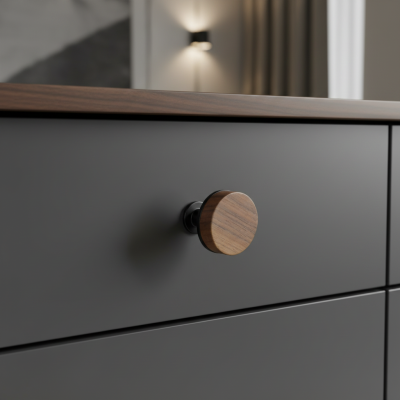 A SOHO gomb kombinációja a lakkozott diófából és a fekete matt fém elemekből modern ipari dizájnt kínál, amely bármilyen bútoron kitűnik. A tömör dió előlap kiemeli a fa természetes erezetét, elegáns és meleg hatást kelt, míg a fekete matt fém alap és láb dinamikus kontrasztot ad a fogantyúnak.