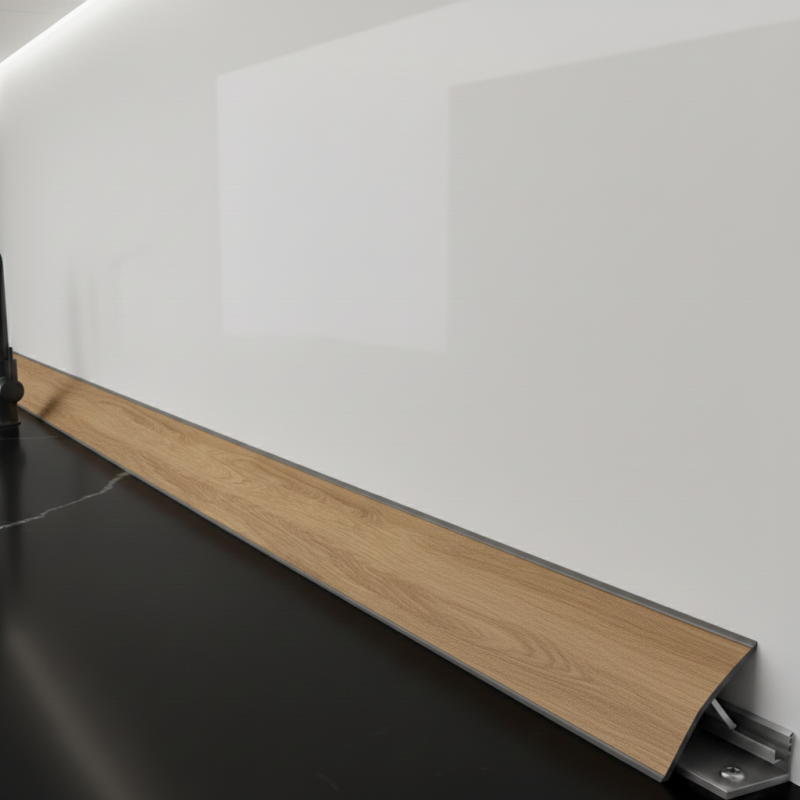 Két részből áll – az alsó rész csavarozható vagy ragasztható a munkalapra, a felső rész pedig rápattintható az alsóra. Az eredmény tiszta, erős és egységes lezárás, ugyanabban a dekorban, mint a munkalap.