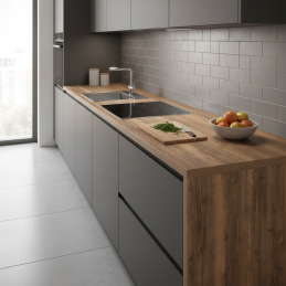 Az EGGER által gyártott munkalapokat magas minőség, kiváló kialakítás és hosszú élettartam jellemzi. A nem nedvszívó anyag és összetétel lehetővé teszi a könnyű tisztítást, és növeli a konyhai munkahely higiéniai komfortját.