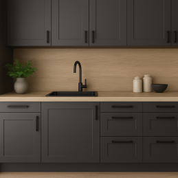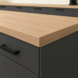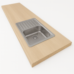 Kiváló minőségű forgácslapból készült munkalap, tartós laminált bevonattal, amely a szokásos használat során garantálja a karcolásokkal, kopással, igénybevétellel és hővel szembeni nagyfokú ellenállást. A modern dekoráció elegáns megjelenést kölcsönöz konyhájának vagy munkaterületének.