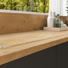 A lap kiváló minőségű faforgácslapból készül, amelyet ellenálló EGGER laminátummal borítottak, így hosszú élettartamot és ellenállást biztosít a karcolásokkal, kopással, igénybevétellel vagy a háztartási hővel szemben. Ezáltal ideális megoldás konyhába és munkaterületre egyaránt.