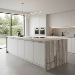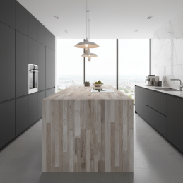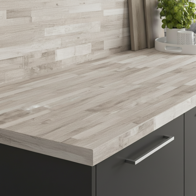 Az elegáns és természetes hatású KRONOSPAN munkalap a Linen Block Wood (K029 SU) dekorban harmonikus fa megjelenést visz a belső térbe finom textúrával és világos bézs-szürke árnyalatokkal. Ez a dekor ötvözi a fa természetes erezetét visszafogott színkontraszttal, így otthonos és modern hangulatot teremt a konyhában vagy a munkatérben.