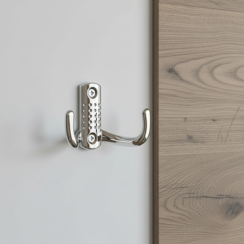 Elegáns bútorakasztó két kampóval, alkalmas kabátok, táskák vagy kiegészítők számára. Fényes krómozott felületének köszönhetően modern hatást kelt, és könnyen kombinálható különböző bútor- és vasalat-típusokkal.