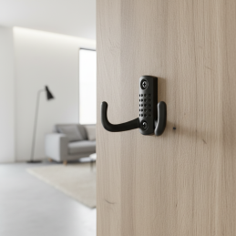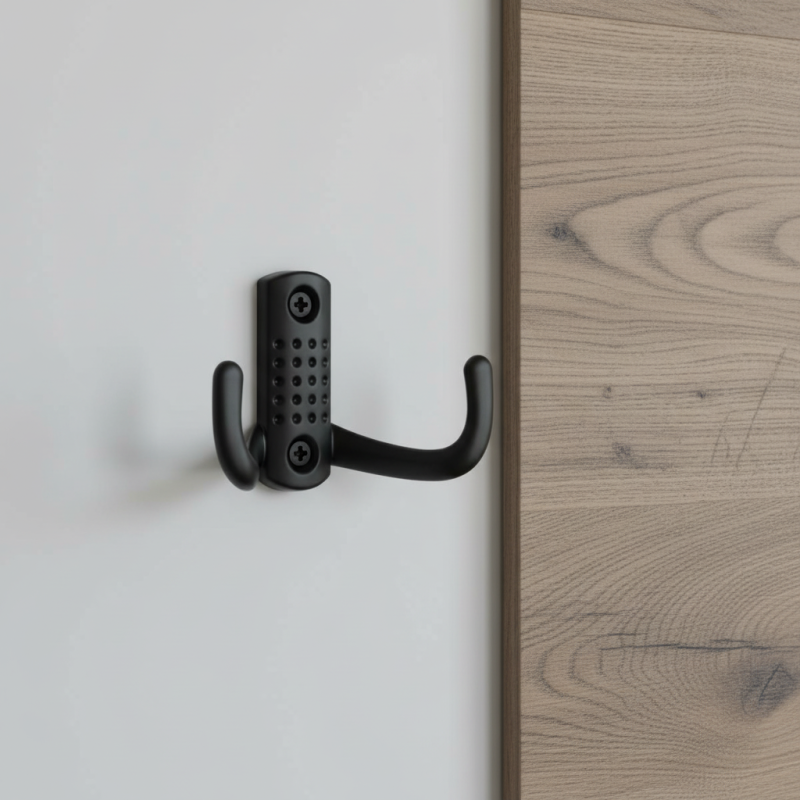 Klasszikus bútorakasztó két kampóval, elegáns és praktikus ruhák vagy kiegészítők tárolására alkalmas. Minimalista dizájnjának és matt fekete felületének köszönhetően modern és hagyományos enteriőrökbe is illik.