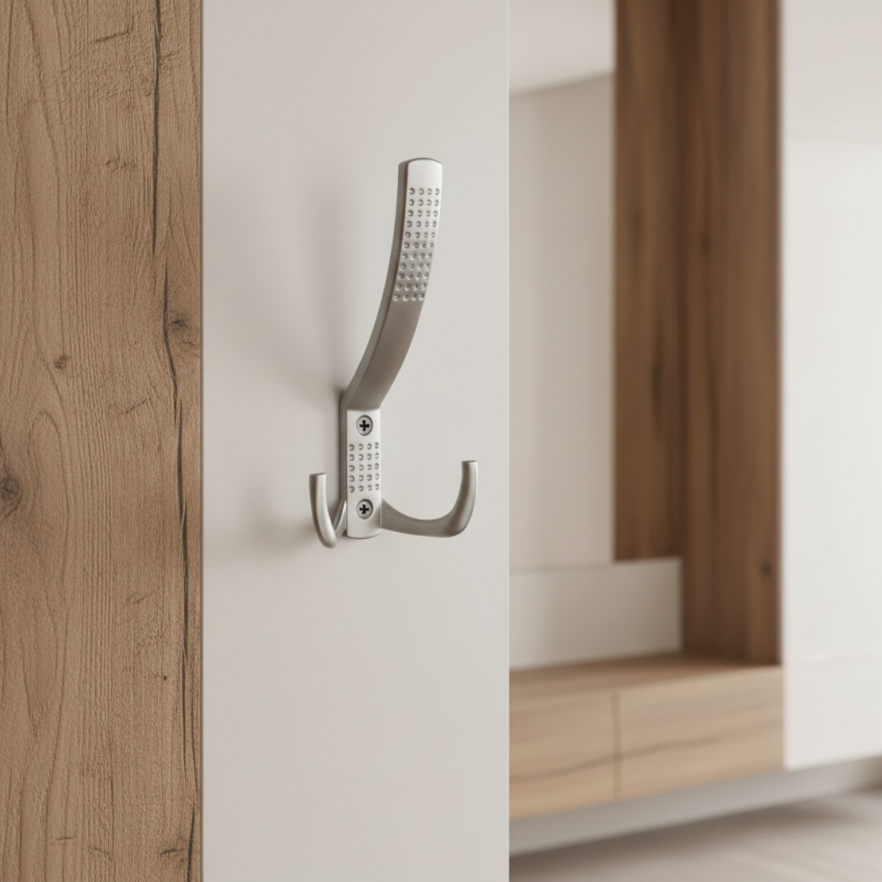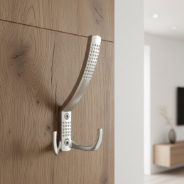 Modern nagyobb méretű bútorkampó két erős akasztóval, mindennapi használatra tervezve, nagyobb igénybevétel esetén is. Matt króm időtlen, elegáns és univerzális megjelenést kölcsönöz a kampónak, amely könnyen kombinálható bármilyen enteriőrrel.