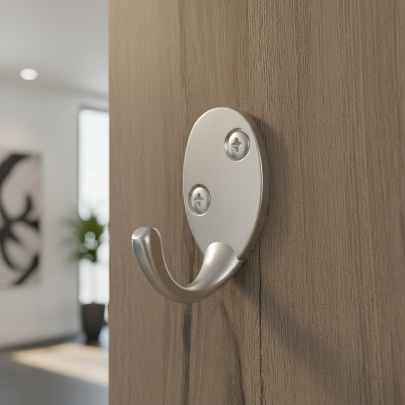 Egyszerű, elülről szerelt fogas, 39 mm magas és 25 mm széles. A rögzítőcsavarok a csomagban találhatók.