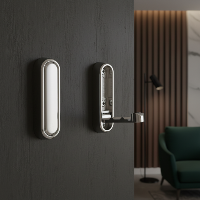 Egyszerű, elölről szerelhető fogas, 74 mm magas és 24 mm széles. A rögzítőcsavarok a csomagban találhatók. Az akasztó egyszerűen, nyomásra kifordul. Az akasztó felületre szerelhető, és nem kell a bútorba vagy anyagba marni.