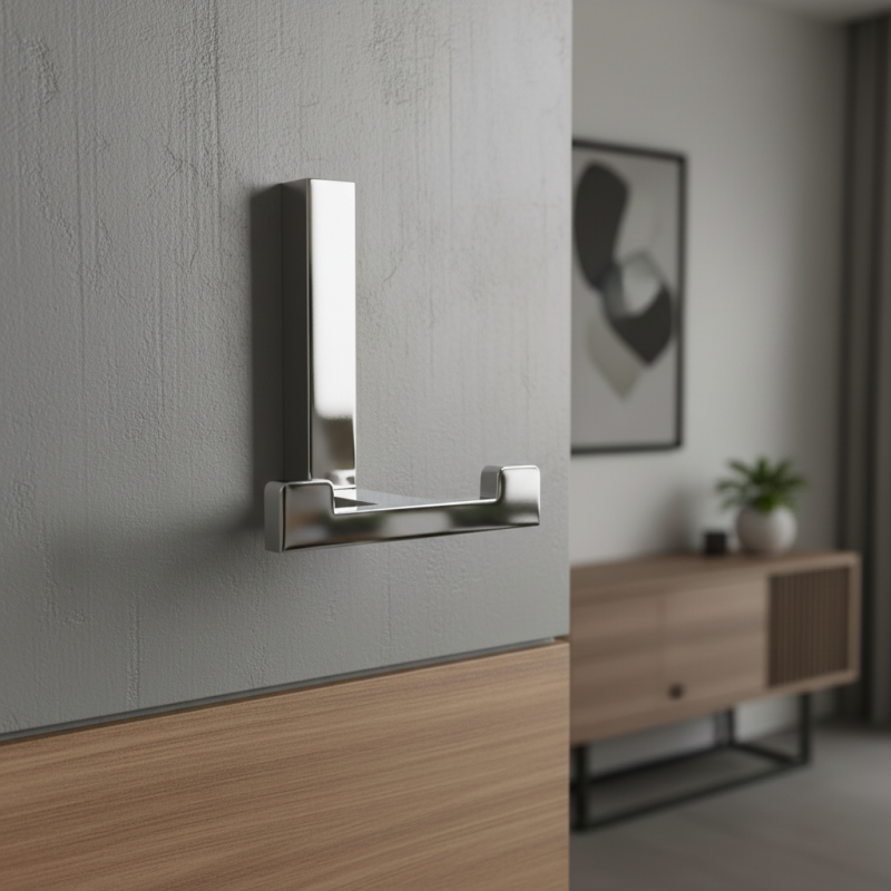 Luxus NEXT DUO akasztó fényes króm kivitelben a NEXT modern kollekció elegáns kiegészítője, amely többféle akasztótípust kínál egységes, minimalista dizájnban.