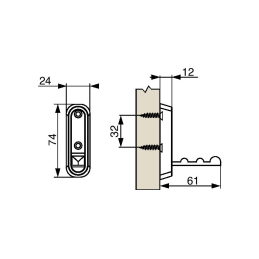 Egyszerű akasztó elölről történő szereléssel, 74 mm magassággal és 24 mm szélességgel. A rögzítőcsavarok az akasztó tartozékai. Az akasztó egyszerűen, nyomással kihajtható. Az akasztót felületre kell szerelni, nem szükséges a bútorba vagy anyagba marni.