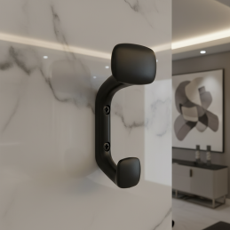 A modern SIMS bútorakasztó elegáns matt fekete kivitelben praktikus és stílusos kiegészítő az előszobába, folyosóra, fürdőszobába vagy gardróbba. A minimalista kialakítású, két akasztóval ellátott dizájn kényelmes kabátok, dzsekik, táskák vagy kiegészítők felakasztását teszi lehetővé.