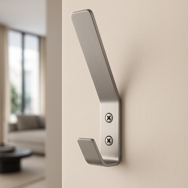Az elölről történő szerelés lehetővé teszi az egyszerű, pontos és stabil rögzítést. Az akasztó alkalmas dzsekik, kabátok, törölközők vagy táskák felakasztására.