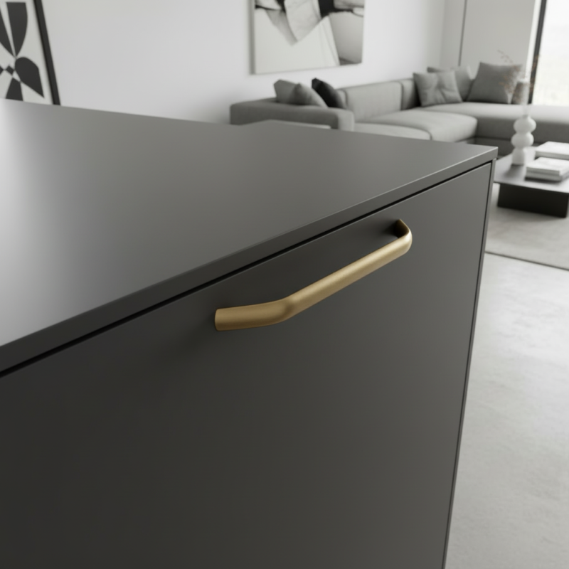 A DIVA fogantyú kefélt arany felülettel elegáns és időtlen kiegészítő, amely modern, minimalista és ipari enteriőrökbe is illik. Finoman lekerekített formája és minőségi fém kidolgozása prémium megjelenést kölcsönöz a bútornak. A rozsdamentes szín univerzális, könnyen kombinálható, tiszta és professzionális hatást kelt – remek választás konyhába, fürdőszobába vagy nappaliba.