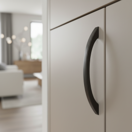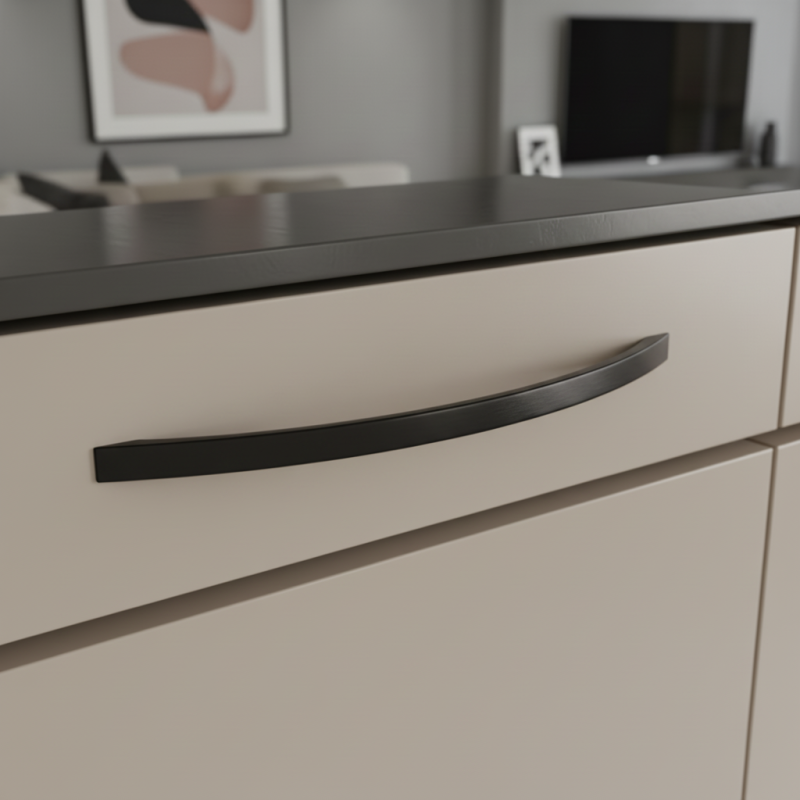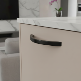 Elegáns fogantyú EMILIO modern kivitelben fekete matt ideális kiegészítő dizájnos konyhákhoz, fürdőszobákhoz vagy nappali bútorokhoz. Enyhén ívelt profilja könnyedséget és kellemes ergonómiát kölcsönöz a bútornak a fogás során.