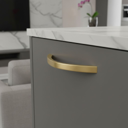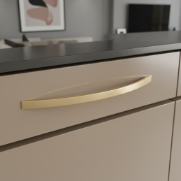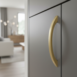Elegáns és időtlen EMILIO fogantyú csiszolt arany kivitelben, amely tökéletes kiegészítője a modern és klasszikus bútoroknak egyaránt. Finoman ívelt formája luxus hatást kelt, ugyanakkor ergonomikus – kényelmesen használható, és stílusos hangsúlyt ad a bútornak.