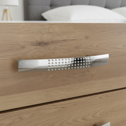A VELLEN fogantyú fényes króm kivitelben ideális választás mindazok számára, akik modern, letisztult és ragyogó megjelenést szeretnének adni bútoruknak. Enyhén ívelt formáját a dekoratív apró pöttyös struktúra egészíti ki, amely látványos dizájnrészletet alkot, és kiemelkedik a konyhákban, fürdőszobákban és nappali terekben is.
