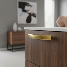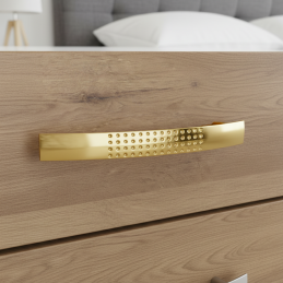 A VELLEN fogantyú fényes arany kivitelben luxust és exkluzivitást kölcsönöz bútorának. Enyhén ívelt formája és az apró pöttyökből álló dekoratív struktúra kombinációja karakteres, mégis elegáns dizájnelemet alkot, amely modern és glamour enteriőrökbe is illik.