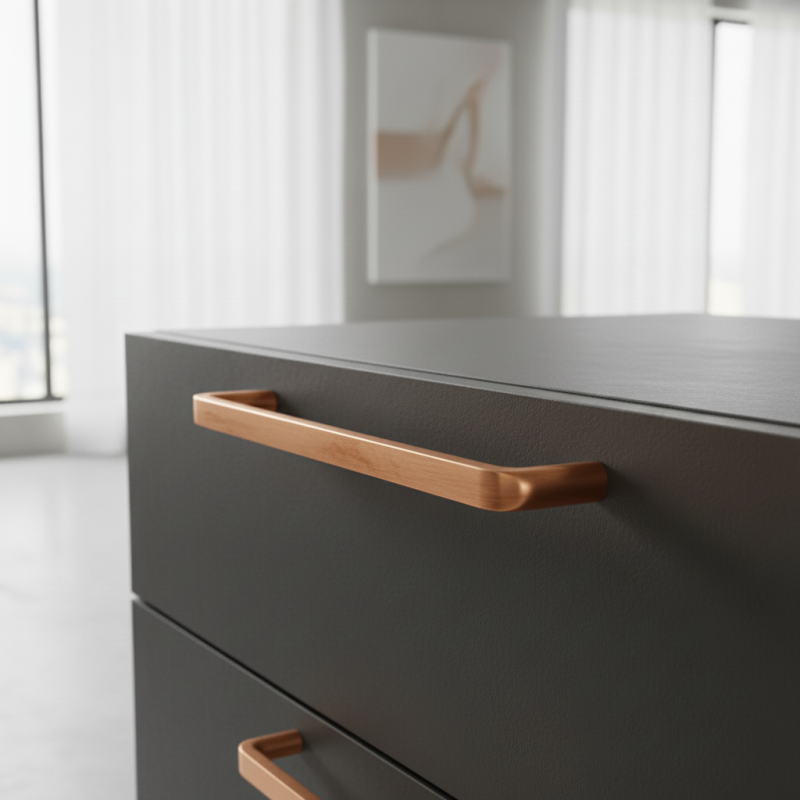 Stílusos BRISA fogantyú réz felülettel, amely kivételes dizájnkiegészítő a modern, ipari és vintage stílusú bútorokhoz. A meleg réz árnyalat egyedi karaktert és érdekes vizuális hangsúlyt ad a szekrényeknek vagy komódoknak, amely gyönyörűen érvényesül sötét fán, fekete bútoron vagy világos felületeken.