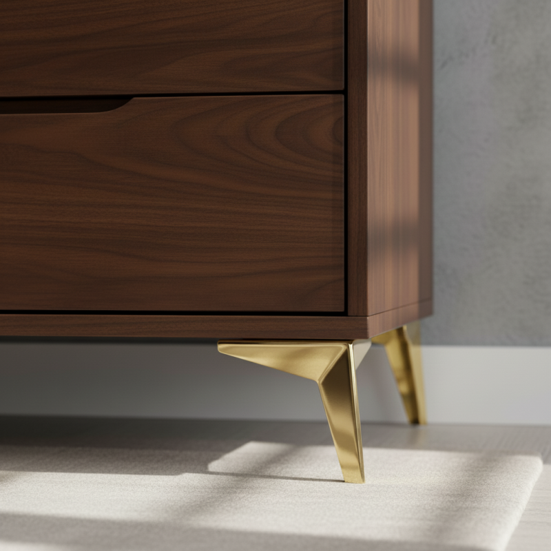 A bútorláb LANIA arany, fényes kivitelben feltűnő dizájnelem, amely luxus és modern jelleget kölcsönöz a bútornak. Elegáns, geometrikus formatervezése könnyed és légies hatást kelt, ugyanakkor stabil és erős támaszt biztosít. A fényes arany felület prémium hangsúlyt ad, amely gyönyörűen érvényesül sötét fán, matt felületeken és világos dekorokon is.