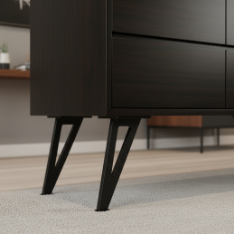Dizájnos láb JAPAN modern kivitelben fekete matt ideális választás komódokhoz, szekrényekhez, TV állványokhoz vagy minimalista bútor összeállításokhoz. Jellegzetes formája, amelyet a japán esztétika inspirált, elegánsan, finoman hat, ugyanakkor stabilitást és könnyedséget kölcsönöz a bútornak.