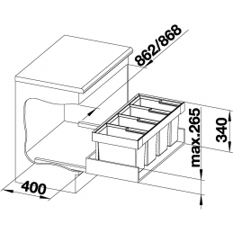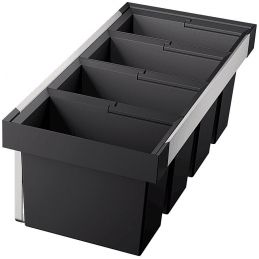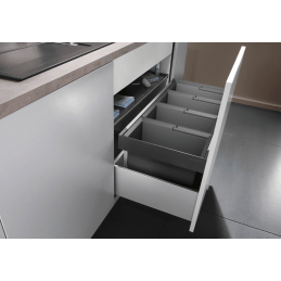 Blanco Flexon II 90/4 egy modern és rendkívül tágas hulladékválogató rendszer, amelyet alsó konyhaszekrények fiókkal történő beépítésére terveztek. A 3 × 19 l és 1 × 16 l edény kombinációjának köszönhetően elegendő helyet kínál a kommunális hulladék hatékony szelektálásához a magasabb igényű háztartásokban.