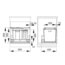 A szemetes egy teljesen kihúzható fiókba illeszkedik, amely hosszanti relinggel vagy magas oldallal van ellátva, így biztosítva a könnyű kezelhetőséget. A BLUM, GRASS és HETTICH teljes fiókokkal kompatibilis, a rendszer csendes és zökkenőmentes működést garantál.