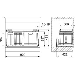 A Franke Sorter 350-90 Composta tartalmaz egy 40 literes műanyag kukát, amelybe akár két zsák is elfér, egy második 22 literes kukát és egy másik 5,5 literes kukát a biohulladék számára. Ehhez jön még egy hátsó kosár. Ez hatékony megoldást kínál a hulladékok hármas szelektálására.