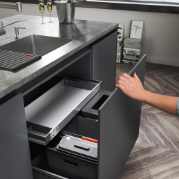 A kosarak a teljes kihúzású fiókba kerülnek, amely hosszanti relinggel vagy magas oldallal van ellátva, így biztosítva a könnyű kezelhetőséget. A BLUM, GRASS és HETTICH teljes fiókokkal kompatibilis rendszer csendes és zökkenőmentes működést garantál.