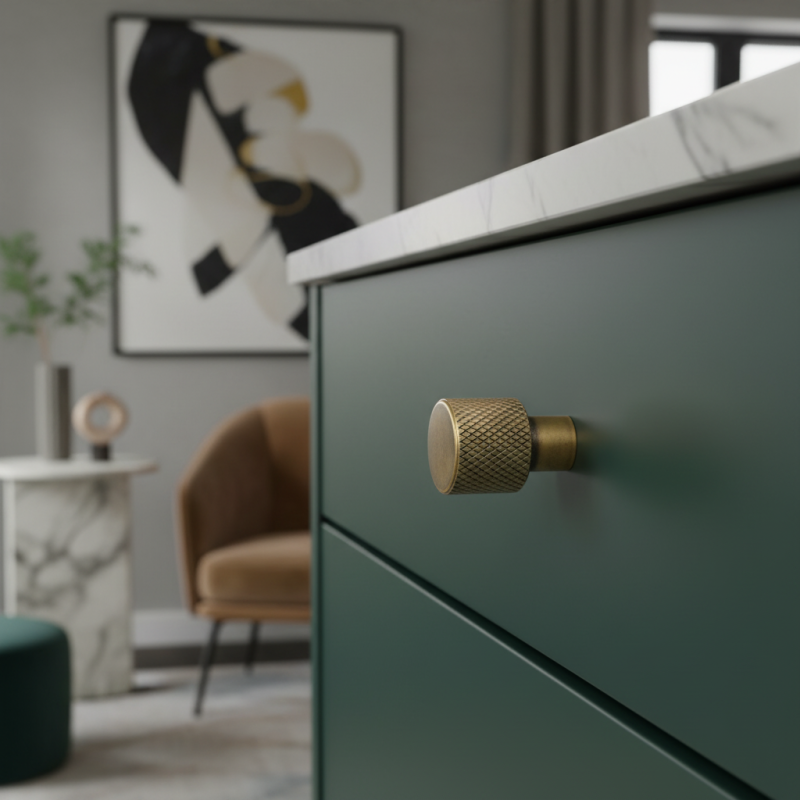 Az INDUST I. ipari fogantyú luxus antik arany felülettel ötvözi a modern ipari stílust az elegáns retro hangulattal. A markáns bordázott (knurled) textúra robusztus, technikai és egyben exkluzív megjelenést kölcsönöz – ideális azokba a belső terekbe, ahol a dizájn és a funkcionalitás találkozik.