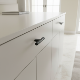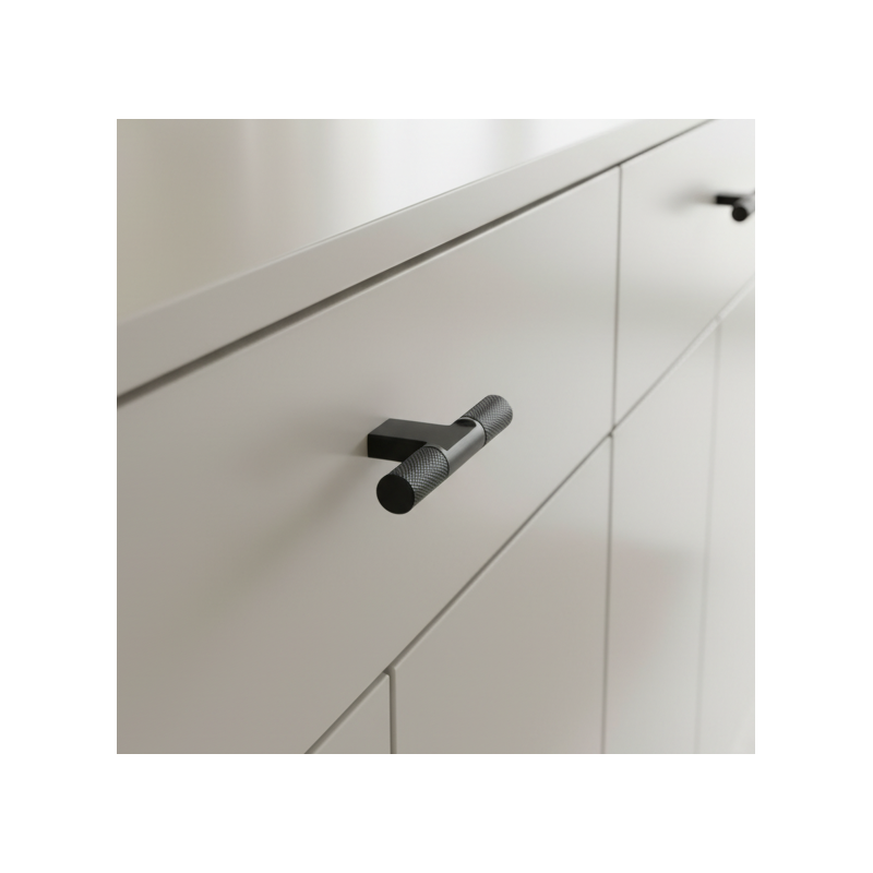 A modern INDUST DUO dizájn gomb fogantyú matt fekete színben ideális kiegészítő ipari és minimalista enteriőrökbe egyaránt. A jellegzetes bordázott felület luxus technikai megjelenést kölcsönöz a fogantyúnak, miközben kényelmes és biztos fogást biztosít.