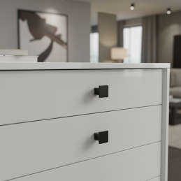A AXON gombfogantyú elegáns fekete matt kivitelben ideális választás a modern belső terekhez. A minimalista szögletes dizájn letisztult, időtálló megjelenést kölcsönöz a bútornak, miközben kényelmes és megbízható fogást biztosít. A minőségi kidolgozásnak köszönhetően a fogantyú alkalmas konyhákba, fürdőszobákba, gardróbokba vagy irodabútorokhoz is.