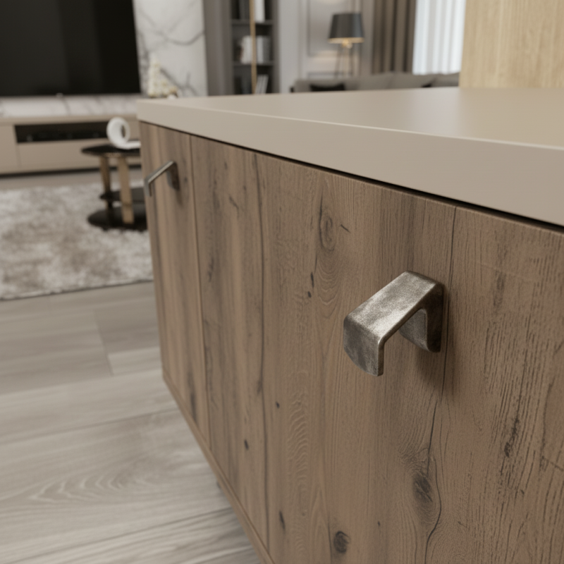Finoman patinázott fém megjelenése különleges karaktert és időtlen esztétikát kölcsönöz a szekrényeknek, komódoknak vagy éjjeliszekrényeknek.