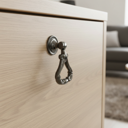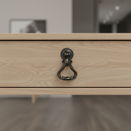 Stílusos rusztikus CORTINA típusú gombfogantyú fényes fekete kivitelben, amely hangsúlyos dizájnelem a klasszikus, vintage vagy rusztikus bútorokhoz. Az elegáns forma mozgatható alsó fogórésszel egyedi karaktert és dekoratív megjelenést kölcsönöz a bútornak.