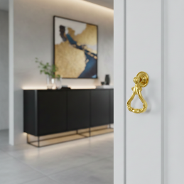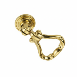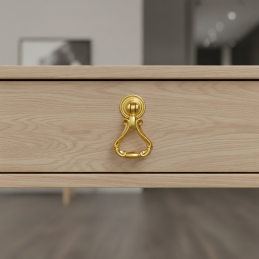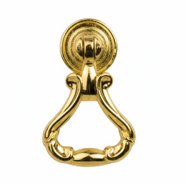Elegáns rusztikus CORTINA típusú gombfogantyú fényes arany kivitelben, amely feltűnő dekoratív kiegészítője a klasszikus és vintage bútoroknak. Gazdagon formázott dizájnja mozgatható alsó fogórésszel luxus megjelenést kölcsönöz a bútornak, és kiemeli annak stílusát.