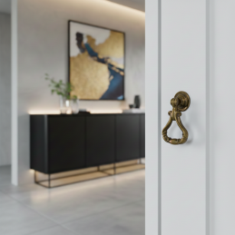 Stílusos rusztikus CORTINA gomb típusú bútorfogantyú antik sárgaréz kivitelben, amely ideális kiegészítője a klasszikus és rusztikus bútoroknak. Gazdagon formázott kialakítása mozgatható alsó fogórésszel hiteles történelmi jelleget és eleganciát kölcsönöz a bútornak.