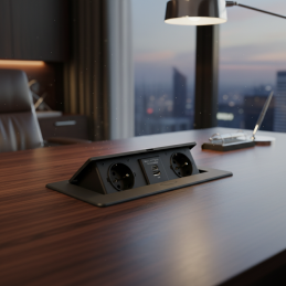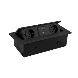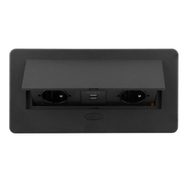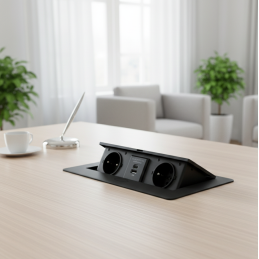 A modern billenő beépíthető elektromos aljzat KOMBI BOX praktikus és elegáns megoldás íróasztalokhoz, konyhaszigetekhez, irodabútorokhoz vagy nappali falakhoz. A billenő mechanizmusnak köszönhetően az aljzat használaton kívül rejtve marad, és nem zavarja a belső tér letisztult dizájnját.
