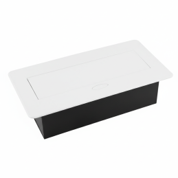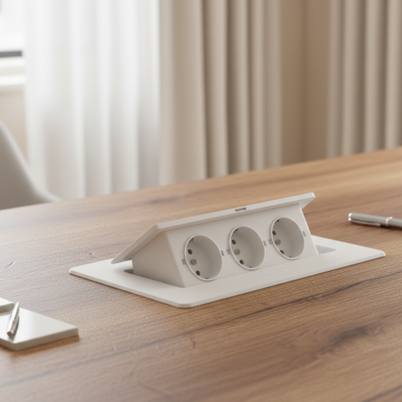 Modern, felnyitható beépített elektromos aljzat, amely munkalapba vagy bútorba (pl. nappali fal, íróasztal vagy konyhasziget a mosogatótól biztonságos távolságban) történő beépítésre alkalmas. A felnyitható mechanizmusnak köszönhetően az aljzatok könnyen elrejthetők, amikor nincsenek használatban, így a munkafelület tiszta és esztétikus marad.