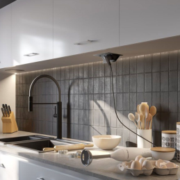 A kompakt, billenő elektromos aljzat modern és ergonomikus kialakítással asztalba, konyhapultba vagy bútorba (pl. nappali fal, irodabútor) való beépítésre készült. A vezérlés nagyon egyszerű – a nyitás gombnyomással, a zárás kézi visszacsukással történik.