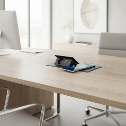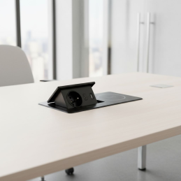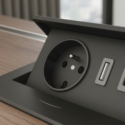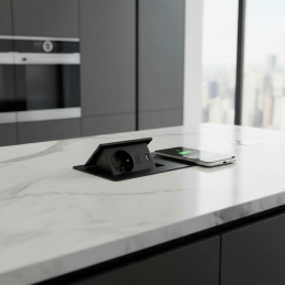 Modern és ergonomikus felnyitható elektromos aljzat, amely munkalapba, konyhapultra vagy irodabútorba szerelhető. Egyszerű gombnyomással (push-to-open) nyílik, és kézzel zárható vissza. Praktikus és biztonságos megoldást kínál elektronikai eszközök töltésére és készülékek csatlakoztatására.