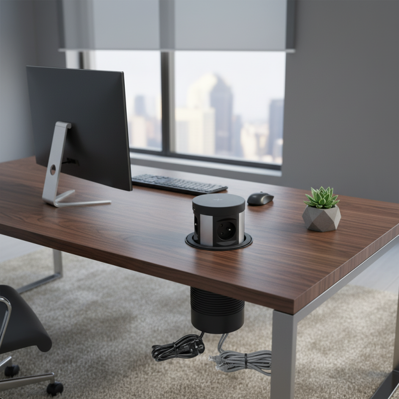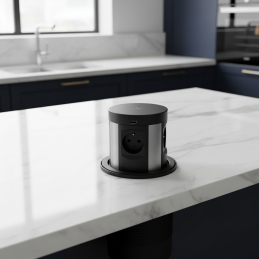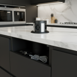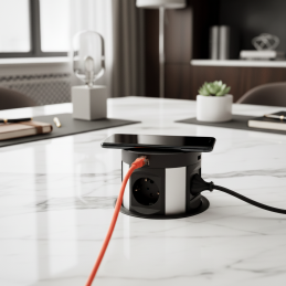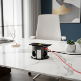 Exkluzív, kihúzható aljzategység, amely alkalmas konyhába, irodába vagy tárgyalóterembe. Teljes körű csatlakoztathatóságot biztosít – 4× 230 V-os aljzat a teljes kerületen, 2× USB port töltéshez és 2× RJ45 hálózati port számítógépes hálózathoz való csatlakozáshoz. Az elegáns dizájn lehetővé teszi, hogy a készüléket közvetlenül a munkalapba rejtse, és csak akkor használja, amikor szükséges.