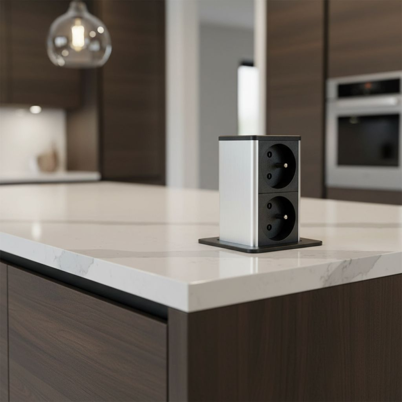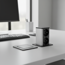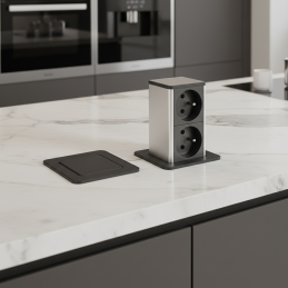 Az elegáns SQUARE UP kihúzható aljzat matt fekete színben praktikus és esztétikus megoldást kínál konyhákhoz, íróasztalokhoz vagy irodákhoz. Zárt állapotban észrevétlen, tökéletesen beleolvad a bútor felületébe – megnyomás után finoman kiemelkedik, és két, francia szabvány szerinti aljzatot tesz elérhetővé.