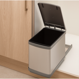 Univerzális kihúzható hulladékgyűjtő 16 literes űrtartalommal, az alsó konyhaszekrény aljára szerelhető. Ideális megoldás a modern konyhákba, ahol helyet kell megtakarítani, ugyanakkor könnyű és higiénikus hulladékválogatást kell biztosítani. Alkalmas legalább 30 cm-es szekrényszélességű szekrényekhez.