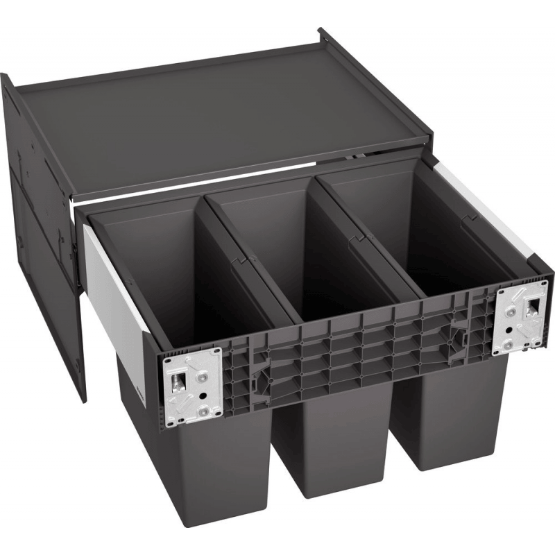 A rendszer 60 cm széles alsó szekrényekhez készült, és három különálló edényt kínál, mindegyiket praktikus fogantyúval a kényelmes kezelés érdekében.