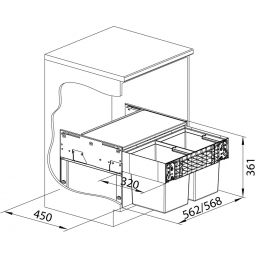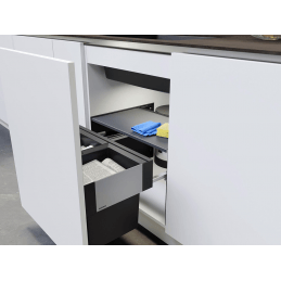A minőségi alumíniumból és műanyagból készült stabil szerkezet kihúzható síneken fut a zökkenőmentes és csendes működés érdekében, 60 cm-es kihúzható előlapú (pánt nélküli) szekrényekhez.