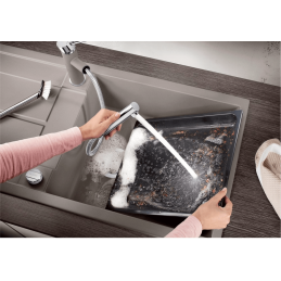 A kétoldalas kialakítás lehetővé teszi a medence tájolásának kiválasztását a konyha elrendezése szerint. A kiváló minőségű Silgranit® anyag hosszú élettartamot, nagyfokú ellenállóságot és egyszerű tisztíthatóságot garantál.